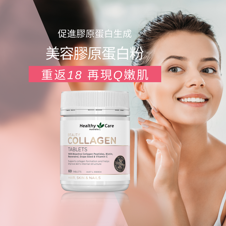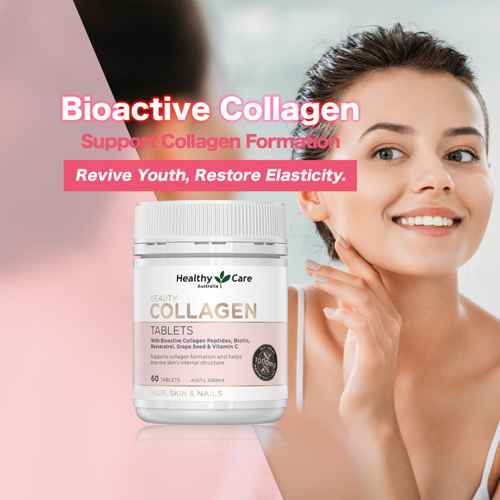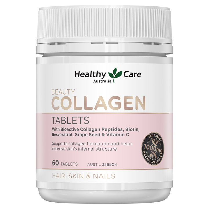 Healthy Care's Beauty Collagen Tablets are scientifically formulated with Marine Bioactive Collagen Peptides to support skin firmness and elasticity from within. This premium blend combines Biotin, Resveratrol, Grape Seed Extract, and Vitamin C, providing antioxidants that help protect cells from free radical damage. This potent formulation also supports collagen formation, contributing to the health of skin, hair, and nails.