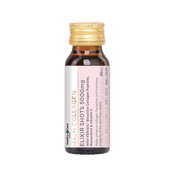 Healthy Care Beauty Collagen Elixir Shots 5000mg provides a potent dose of VERISOL®️ Bioactive Collagen Peptides to support collagen formation, which will help maintain skin integrity.