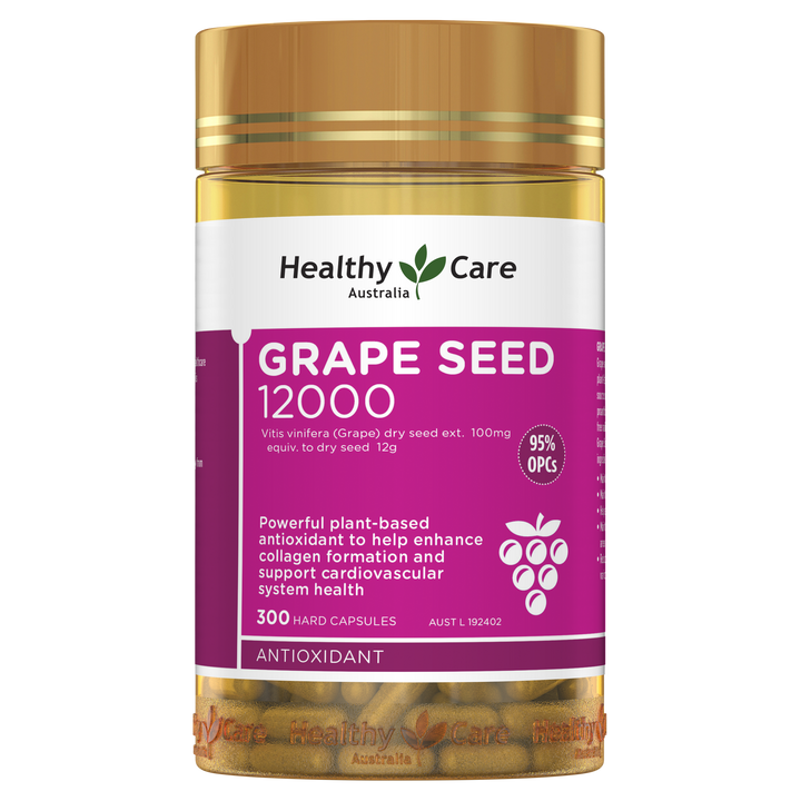 Healthy Care Grape Seed 12000 contains premium grape seed extract, a natural source of flavonoids including oligomeric proanthocyanidins (OPCs)—powerful plant-based antioxidants that help reduce free radical damage to body cells.