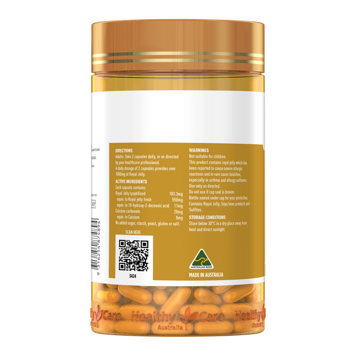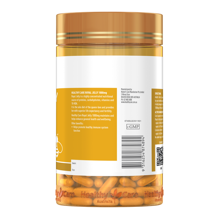 Healthy Care Royal Jelly is a nutrient-rich natural secretion from bees, traditionally used as a tonic to promote vitality and general wellbeing. Carefully formulated with high-quality royal jelly extract, it preserves the full spectrum of proteins, carbohydrates, vitamins, minerals, and 10-HDA (10-Hydroxy-2-decenoic acid), a key active compound unique to royal jelly.