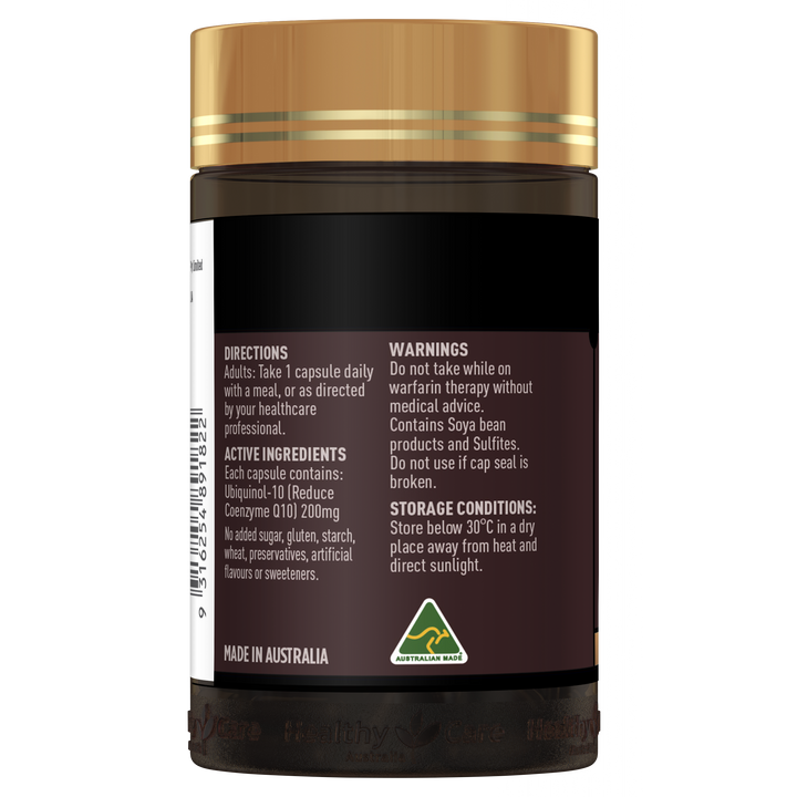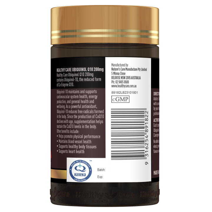 Healthy Care Ubiquinol Q10 200mg contains Ubiquinol-10, the reduced and active form of Coenzyme Q10. Ubiquinol supports cardiovascular health, energy production, and general wellbeing while acting as a powerful antioxidant to neutralise free radicals in the body. Since CoQ10 production declines with age, supplementation helps sustain healthy levels for ongoing vitality and heart health.
