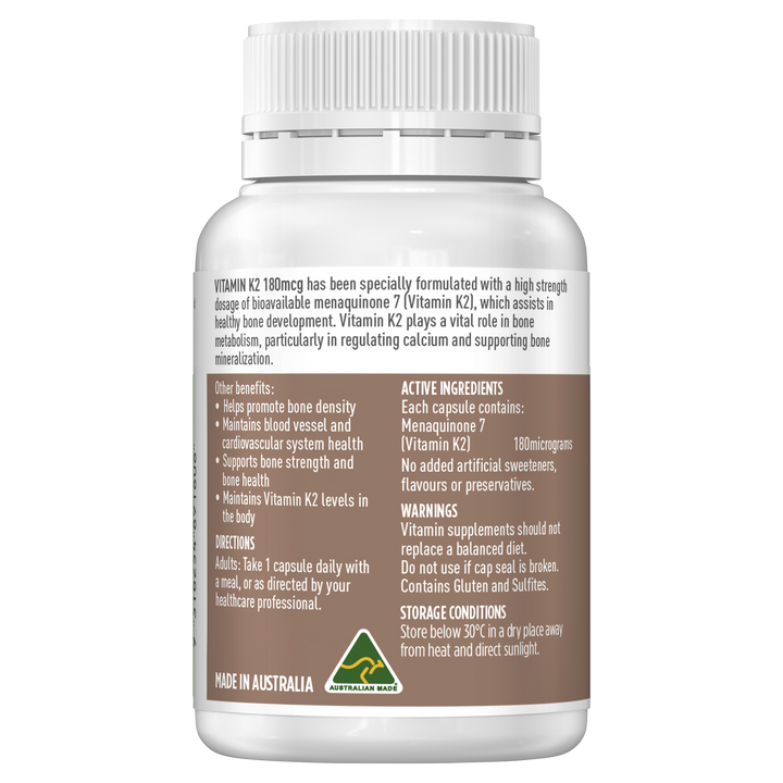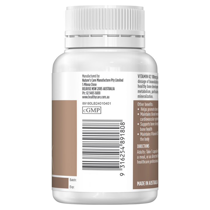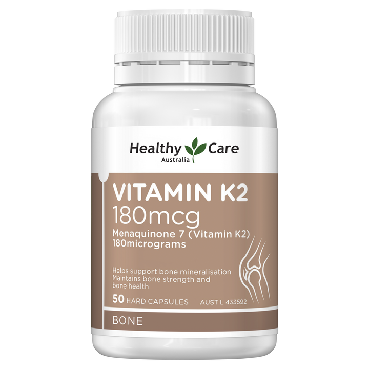 Healthy Care Vitamin K2 180mcg is a high-strength formula with bioavailable menaquinone-7 (Vitamin K2) to support bone development, density, and strength. Vitamin K2 plays a vital role in calcium regulation and bone mineralisation, helping to maintain strong, healthy bones and cardiovascular health.