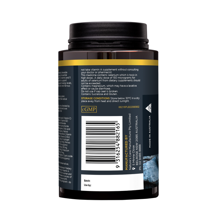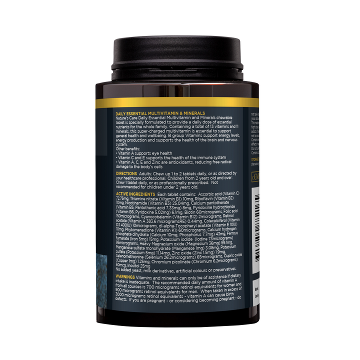 Nature’s Care Daily Essential Multivitamin & Minerals provides broad nutritional support for the whole family in a convenient, great-tasting chewable format. Each tablet supplies 13 essential vitamins and 11 key minerals to help fill dietary gaps, support daily energy production, and maintain general health and wellbeing. Antioxidant nutrients (vitamins A, C, E and zinc) help protect against free radical damage, while vitamin A supports eye health and B-group vitamins support the nervous system.