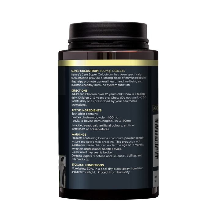 Nature's Care Pro Super Colostrum is a high-strength formula containing 400mg of bovine colostrum powder per tablet. Colostrum is naturally rich in immunoglobulins (antibodies) that help strengthen the body’s natural defenses, maintain a healthy immune system, and support general wellbeing.